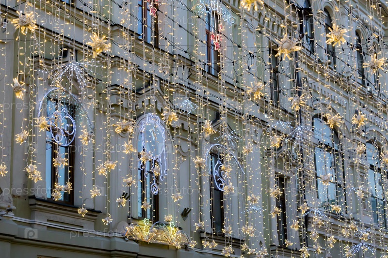Уличное новогоднее украшение. Белые гирлянды над улицей, праздничный фон