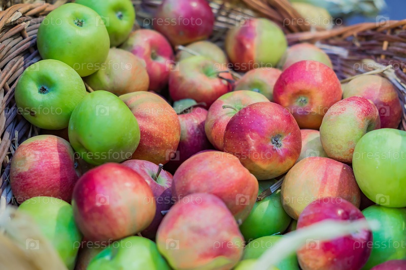 Крупный план красных спелых яблок в корзине на фермерском рынке
