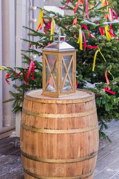 Городское рождественское и новогоднее украшение. Деревянная бочка с деревянным фонарем между двумя праздничными елями