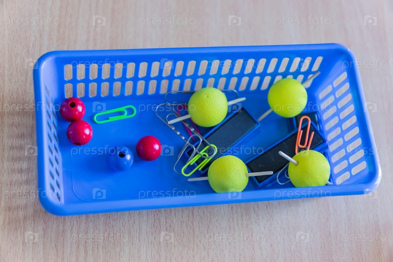 Школьные лабораторные вещи в голубых пластиковых контейнерах. изучение естественных наук
