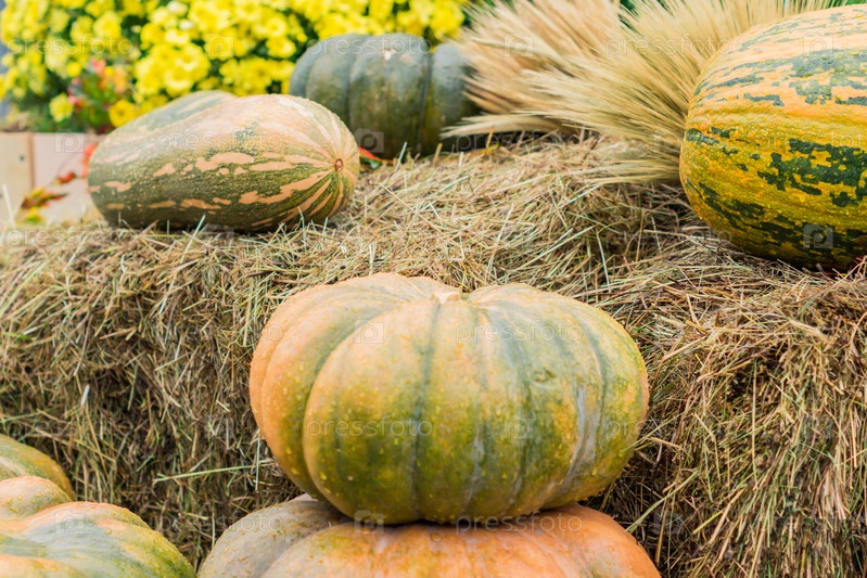 Хэллоуин осеннее украшение из тыкв, цветов и сена на улице. Концепция сельского рынка