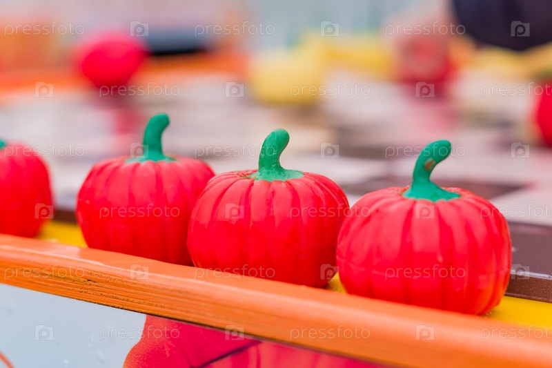 Три пластиковые красные тыквы подряд, вид в перспективе, выборочный фокус