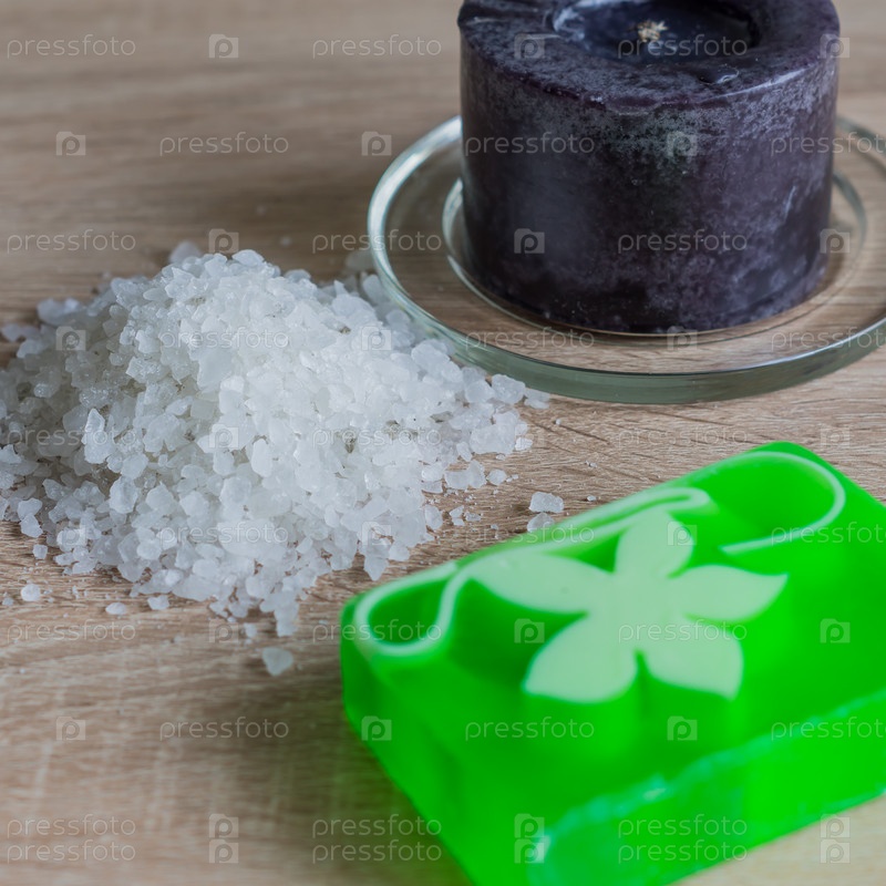 Куча морской соли, мыла и черной свечи на деревянном столе. Натуральный ингредиент для спа и пилинга