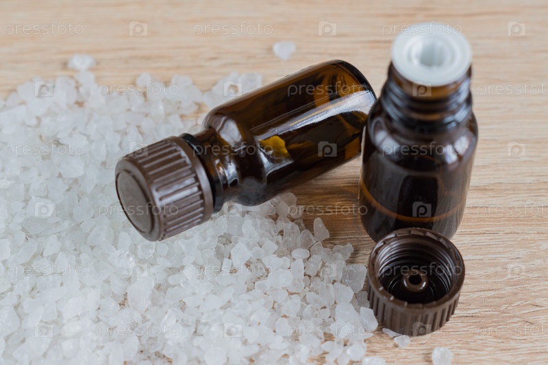 Куча морской соли и бутылки с ароматическим маслом на деревянном столе. Натуральный ингредиент для спа и пилинга