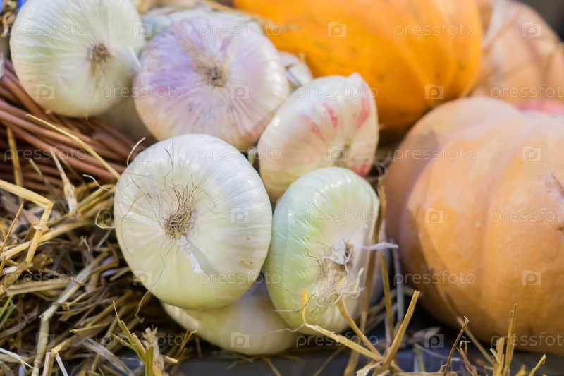 Много тыкв и луковых натюрмортов, осенний фон, выборочный фокус