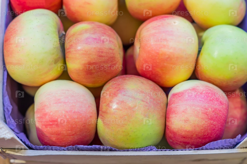 Вид сверху на красные спелые яблоки в деревянном ящике на фермерском рынке