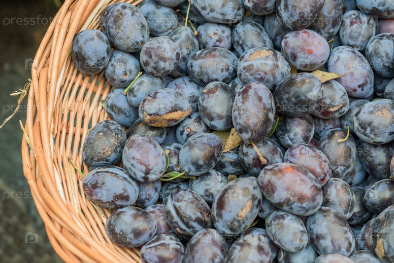 Вид сверху на спелые сливы в корзине на фермерском рынке