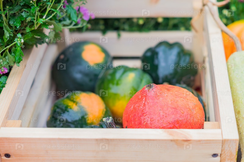 Оранжевые и зеленые тыквы в деревянной коробке, выборочный фокус. Сезонный урожай