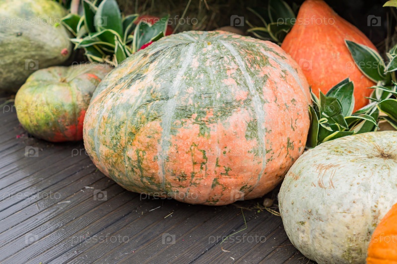 Хэллоуин осеннее украшение из тыкв, цветов и сена на улице. Концепция сельского рынка