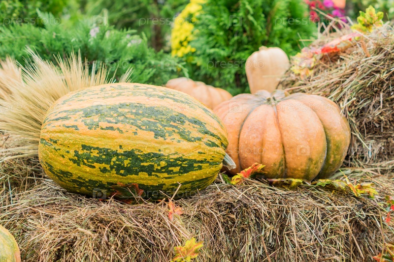 Хэллоуин осеннее украшение из тыкв, цветов и сена на улице. Концепция сельского рынка