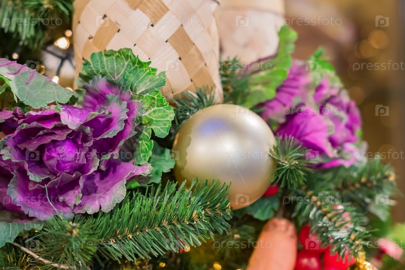 Рождественские и новогодние праздники фон. Рождественская елка украшена золотыми шарами и капустой. Концепция праздника