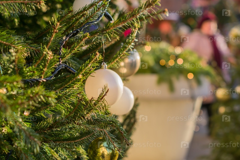 Рождественские и новогодние праздники фон. Рождественская елка украшена золотыми и белыми шарами. Концепция праздника