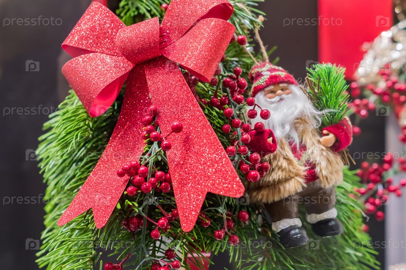 Рождественские и новогодние праздники фон. Рождественская елка украшена красными ягодами, бантом и сантой. Концепция праздника