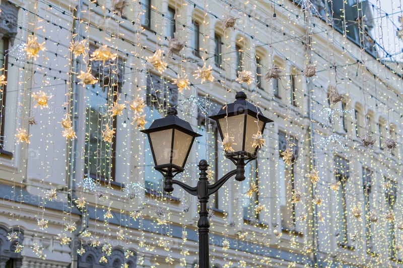 Уличное новогоднее украшение. Белые гирлянды над улицей