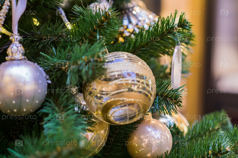 Закройте рождественскую елку, украшенную золотыми и белыми шарами и снежинкой. Новогодний фон