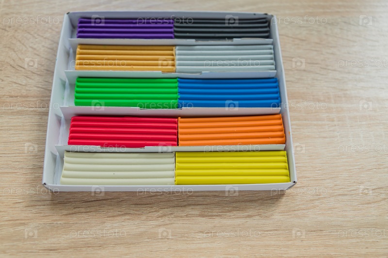 Набор разноцветных пластилиновых брусков для моделирования на деревянном столе. Вид сверху, образование и концепция творчества