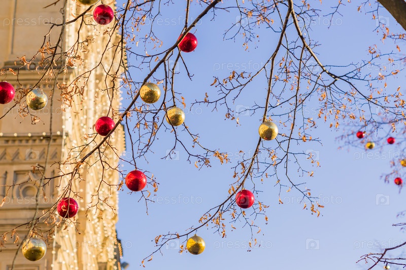 Рождественские и новогодние праздники фон. дерево без листьев, украшенное красными и золотыми шарами