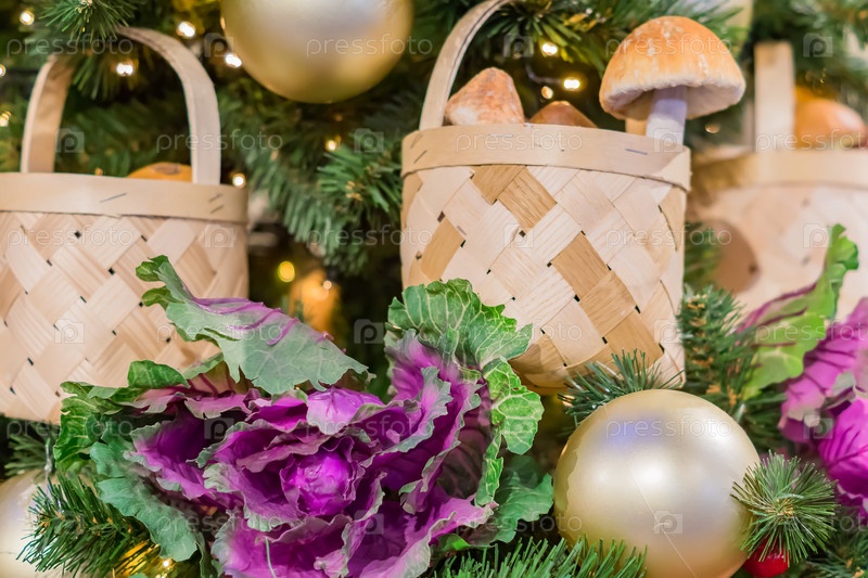 Рождественские и новогодние праздники фон. Рождественская елка украшена корзиной с грибами и капустой. Концепция праздника