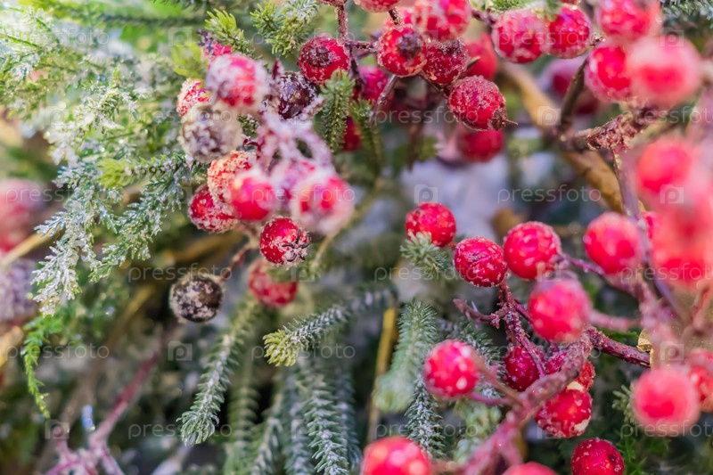 Рождественские и новогодние праздники фон. Рождественская елка украшена красными матовыми ягодами и шариками. Концепция праздника