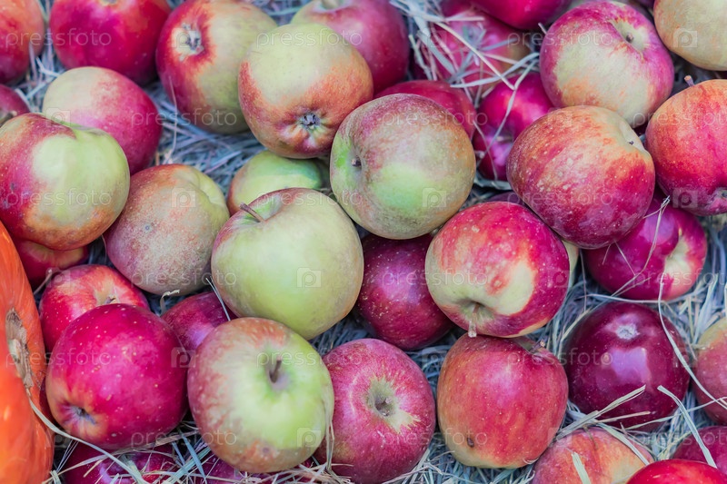 Вид сверху на красные спелые яблоки на сене на фермерском рынке
