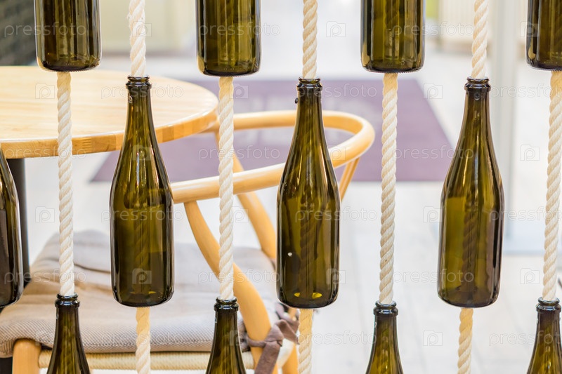 Декоративные элементы интерьера - темные стеклянные пустые бутылки, висящие на веревке, фон