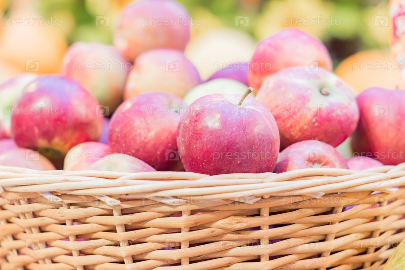 Крупный план красных спелых яблок в корзине на фермерском рынке