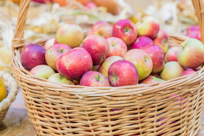 Крупный план красных спелых яблок в корзине на фермерском рынке