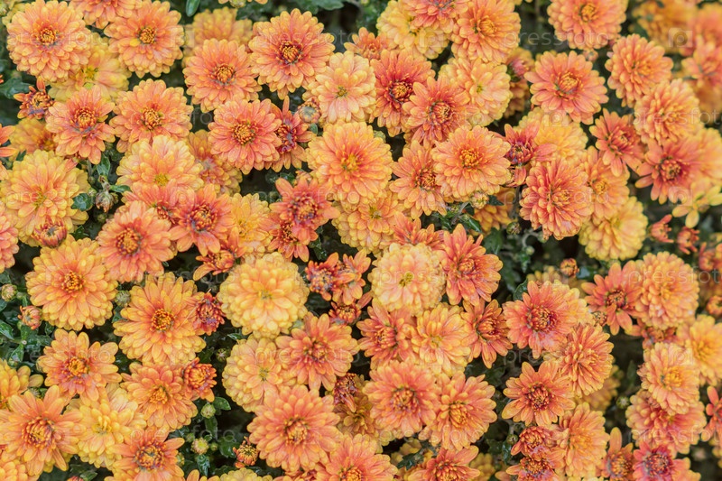 Цветы хризантемы как фон. Поле оранжевых хризантем после дождя. Выборочный фокус