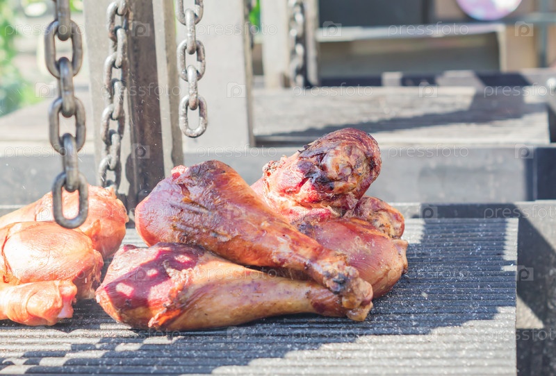 Ножки индейки на гриле. приготовление пищи на открытом огне
