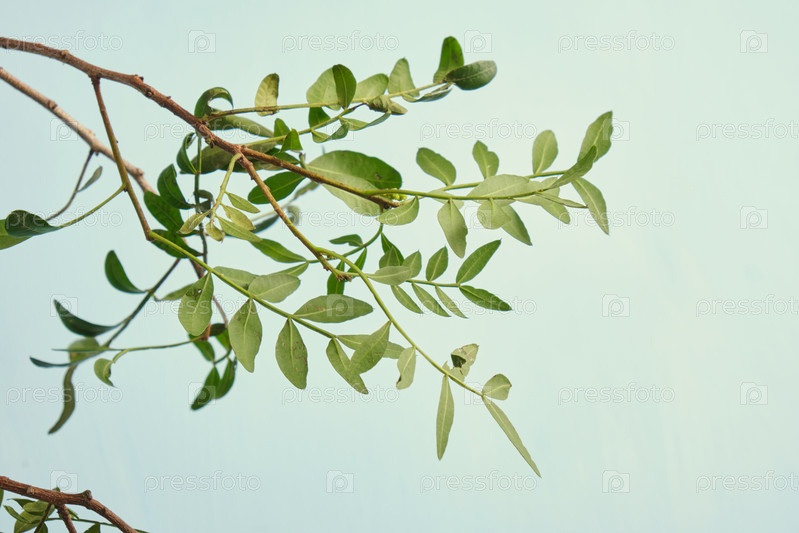 Ветка фисташкового дерева с зелеными листьями на голубом фоне