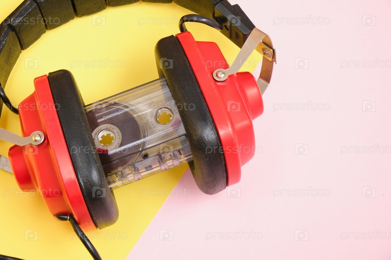 Старые красные наушники и кассета на розовом фоне