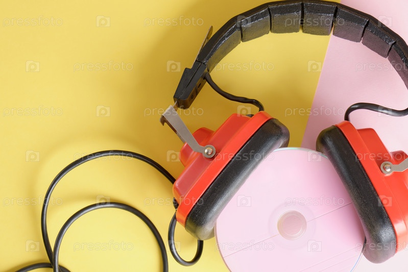 Старые наушники и розовый компакт-диск на желтом фоне
