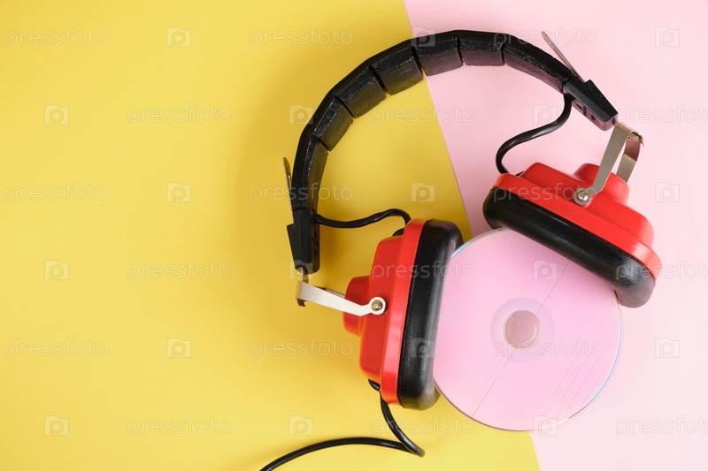 Старые наушники и розовый компакт-диск на желтом фоне