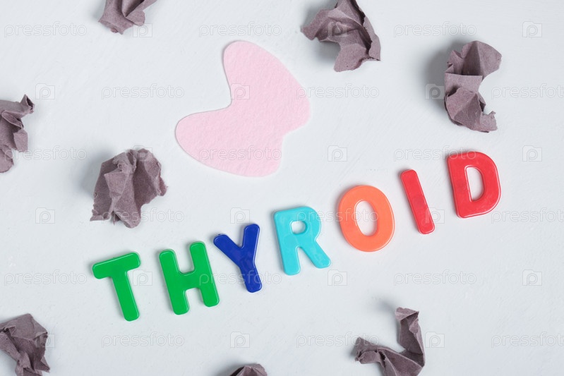 Комки бумаги, войлочная щитовидная железа и надпись щитовидной железы на сером фоне, лечение заболеваний щитовидной железы с помощью концепции диеты