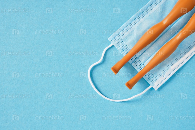 Коричневые кукольные ножки лежат на синей маске на синем фоне, пляжный отдых и тузизм во время эпидемии коронавируса
