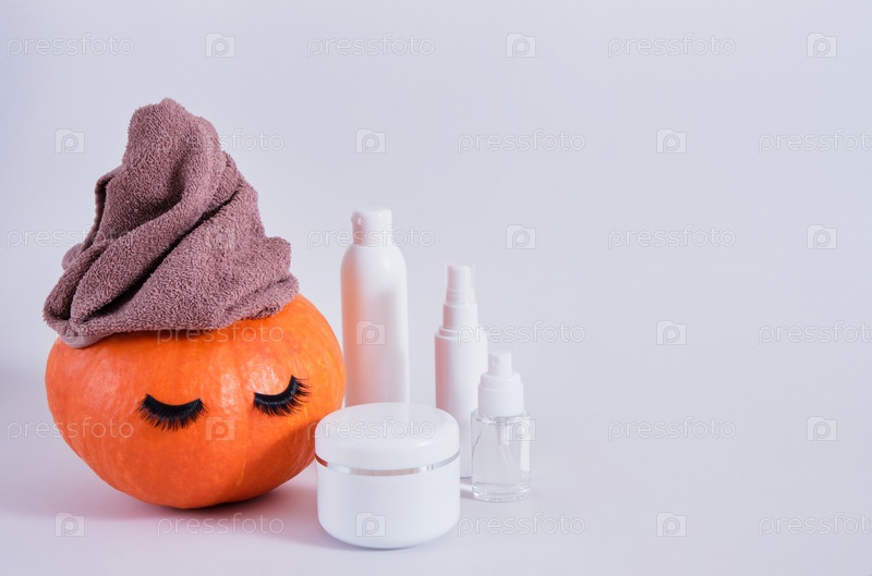 Макет набора косметических контейнеров и тыквы с полотенцем и накладными ресницами на сером фоне, натуральный уход за кожей