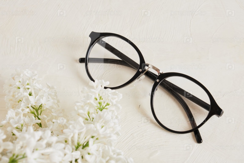 Тренд очков и ветка белой сирени на текстурированном бежевом фоне, очки и цветы