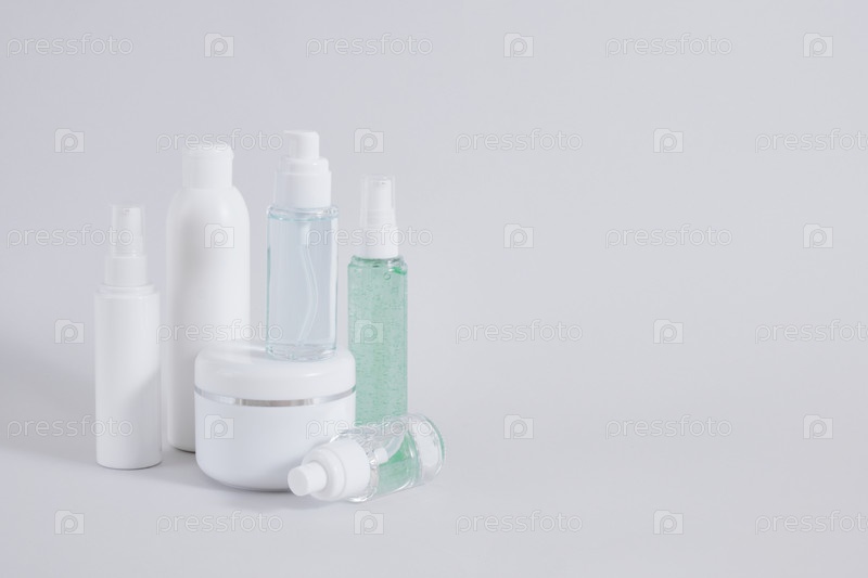 Состав макета различных косметических флаконов на сером фоне, баночки с кремом, флаконов для масла или геля и флакона для духов