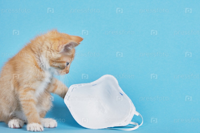 Милый рыжий котенок и защитная маска для лица на синем фоне копией пространства
