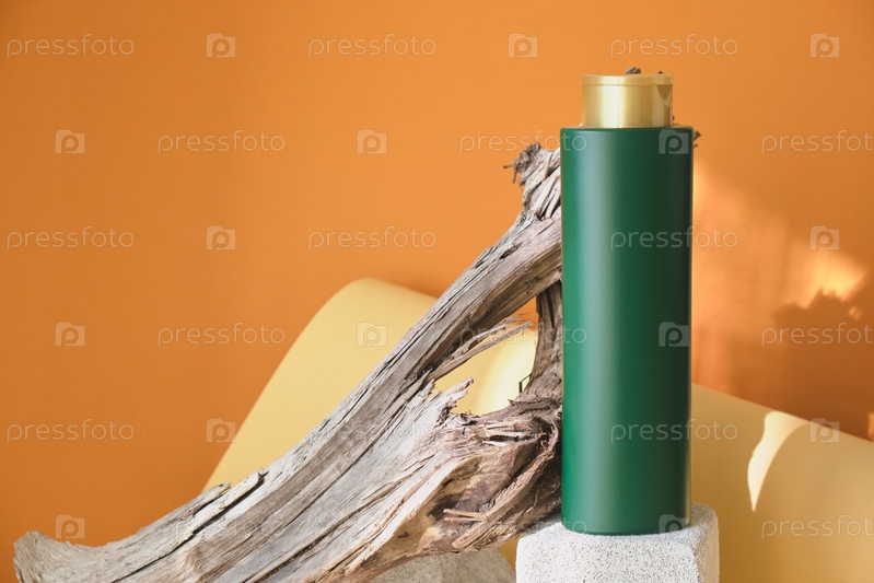 Зеленая бутылка для шампуня или бальзама для волос на бетонном подиуме на фоне деревянной коряги, коричневый фон, солнечный свет из окна, красивые тени