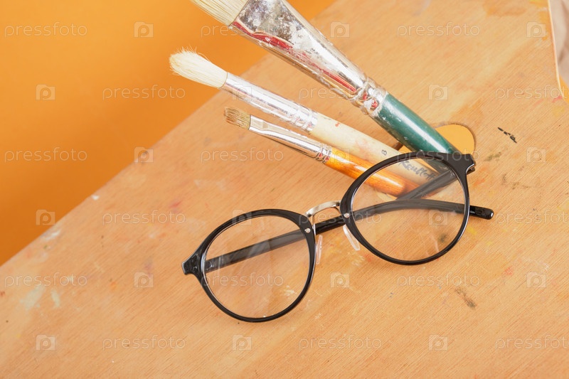 Очки на деревянной палитре коричневого фона, пространство для копирования концепции мастерской художника