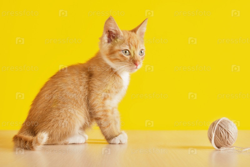 Милый рыжий кот и клубок ниток на желтом фоне