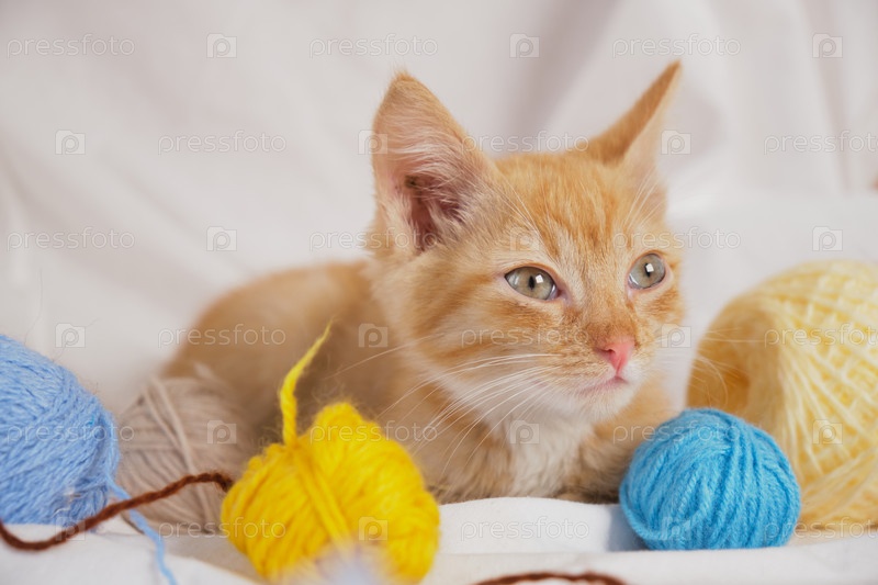 Милый рыжий кот и разноцветные клубки ниток на фоне белого постельного белья, котенок отдыхает после игры на кровати