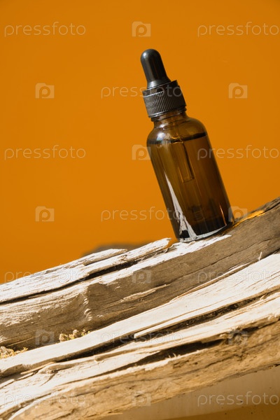 Стеклянная косметическая бутылка с капельницей на бревне на коричневом фоне с ярким солнечным светом. Концепция натуральной косметики, натуральное эфирное масло