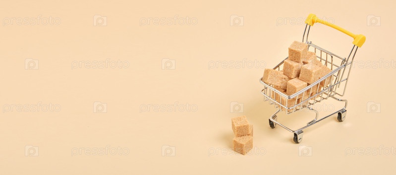Кубики коричневого сахара в миниатюрной тележке для покупок на бежевом фоне
