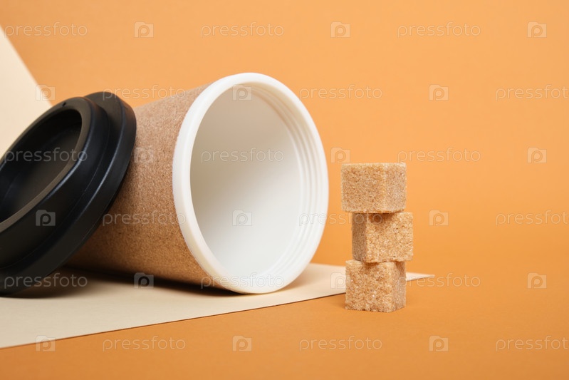 Кубики коричневого сахара и термокружка из пробки на бежевом и коричневом фоне