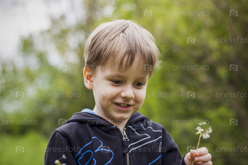 Счастливый мальчик в весенний день в саду дует на белые одуванчики, с него слетает пух. Концепция отдыха на природе в детстве. Портрет милого мальчика