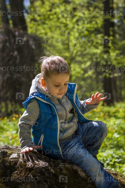 Портрет мальчика в голубой майке в лесу весной. Прогуляйтесь по зеленому парку на свежем воздухе. Волшебный свет от солнечных лучей падает за мальчика