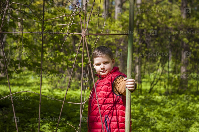Портрет молодого человека в красной майке в лесу весной. Прогулка по зеленому парку на свежем воздухе. Волшебный свет от солнечных лучей падает за мальчика