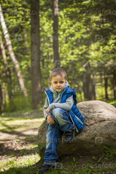 Портрет мальчика в голубой майке в лесу весной. Прогуляйтесь по зеленому парку на свежем воздухе. Волшебный свет от солнечных лучей падает за мальчика